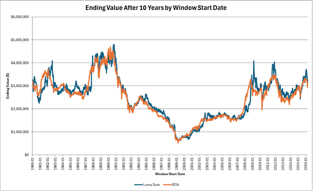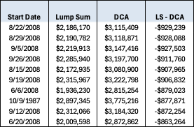 The table below reflects the 10 worst windows for lump sum investing as compared to dollar cost averaging. No surprise, investing everything all at once before the worst of the Global Financial Crisis resulted in meaningfully lower outcomes.