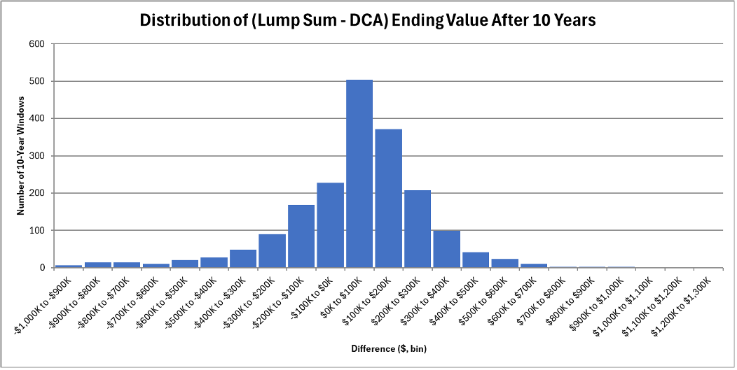 Breaking it down a bit further, the chart below shows the distribution of outcomes, as measured by the difference in ending portfolio values. A positive difference reflects outcomes where the lump sum ending balance exceeded the dollar cost average ending balance.